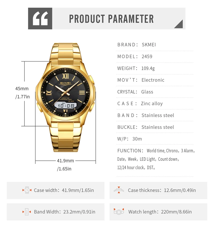 SKMEI 2459 Luxury World Time 3 Alarms Setting DST Analogue Quartz Watch for Men